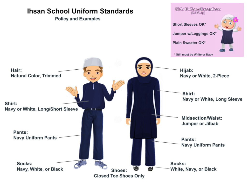 Girls 5th grade + must wear a jumper or jilbab over their shirts/pants to cover midsection.